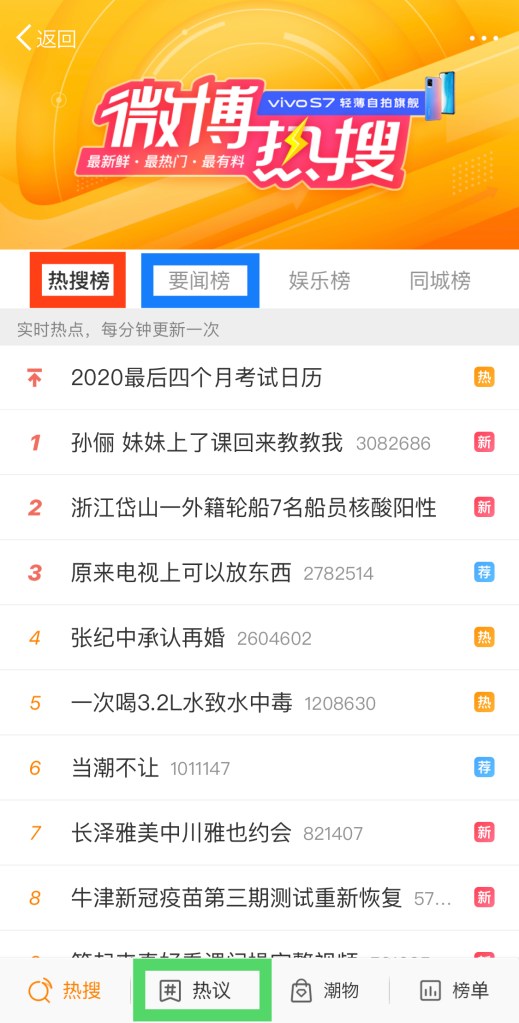 赤いマークの「热搜榜」はデフォルトに表示されるリスト。一分ごとにWeiboユーザーの検索ランキングを更新している。ここは流行っている話題、ニュース、イベント、流行りのネタなど全部混ざっている。
